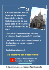 A Basílica Menor Nossa Senhora da Imaculada Conceição – Santa Ifigênia, deu início a uma campanha para melhorar as transmissões ao vivo das celebrações eucarísticas e eventos da Paróquia, para isso acontecer é necessário se inscrever.